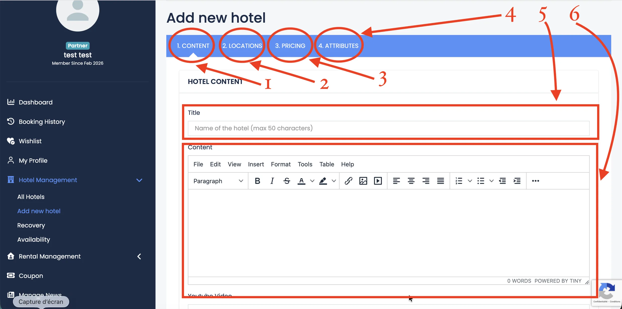 Here, you need to add the Title (5) of your listing. The title should represent the name of your hotel, company, or service.